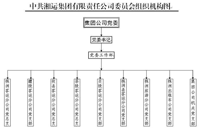 中共湘運集團有限責任公司委員會,隸屬于中共株洲市非公有制經濟組織工委。黨委會常設工作機構黨委工作部。全司共有中共黨員304名。下轄株洲客運分公司黨總支、醴陵客運分公司黨支部、攸縣客運分公司黨總支、茶陵客運分公司黨總支、炎陵客運分公司黨支部、株洲縣客運分公司黨支部、株洲旅游分公司黨支部、株洲出租車公司黨支部、集團公司機關黨支部共9個二級基層黨組織。