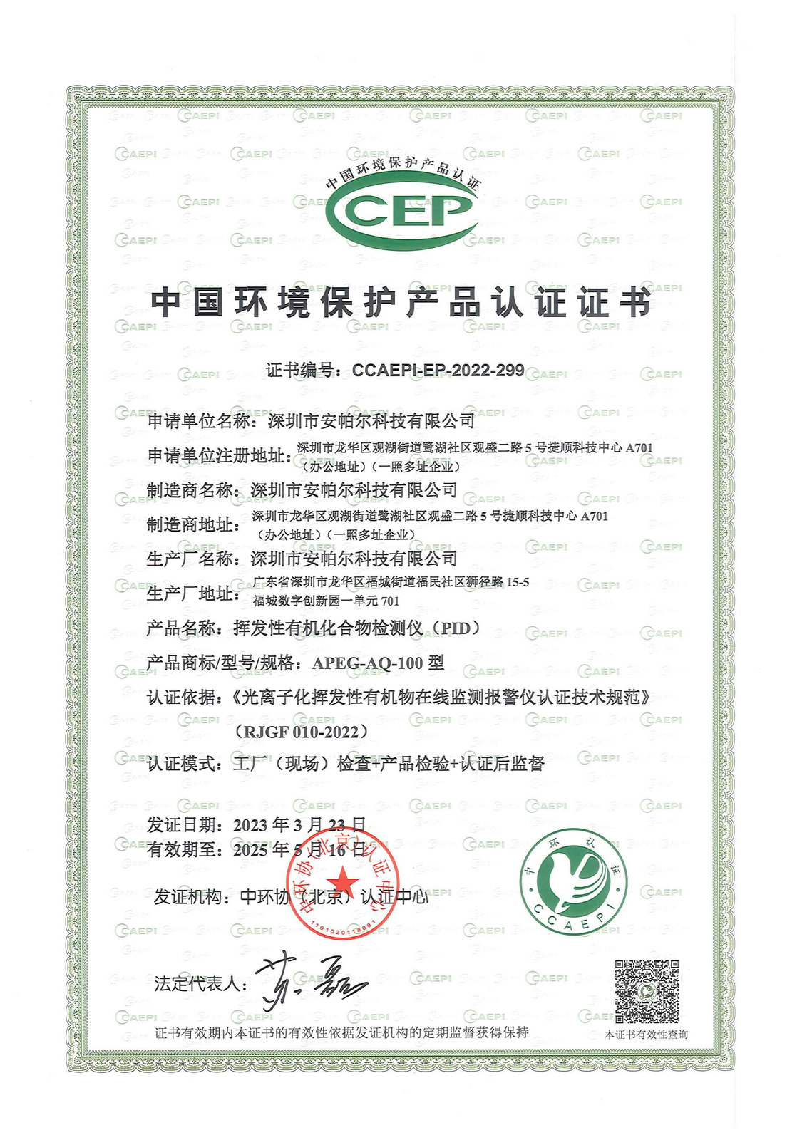 中國環境保護產品認證證書